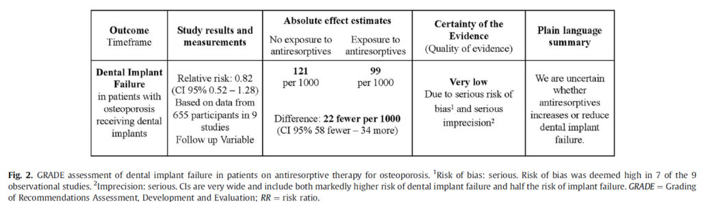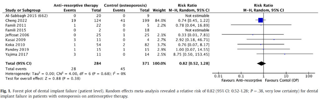 要約すると、骨粗鬆症患者において、骨吸収抑制療法とインプラント失敗リスクの上昇との関連性は認められませんでした。しかし、規模の小さな研究でイベント数が少ない、リスク推定の範囲が広い、バイアスリスクが高い、比較対照試験がないなどのエビデンスレベルの弱さが認められます。加えて、我々の知見では、骨吸収抑制薬がインプラントの失敗リスクを上昇させるのか低下させるのかハッキリしません(図2)。