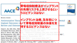 結論:現在のエビデンスからは、骨粗鬆症患者の骨吸収抑制療法とインプラント失敗の間に関連性は認められませんでした。骨粗鬆症患者でBP製剤またはデノスマブを使用している場合でも、インプラントはおそらく安全に埋入でき、インプラント失敗のリスクを上昇させるというエビデンスはありません。